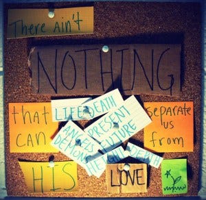 Not life, not death, not anything created, nothing in your life, no worries, no fears, no doubts, no mistakes, no failiures, no nothing (yes Enligsh majors/teachers. That's a double neagive. Sorry :) ). Through Jesus, nothing can separate us from God's love.